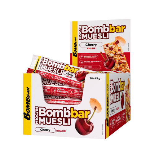 арахис, водорастворимые волокна кукурузы, вишня, хлопья овсяные (содержат глютен), рисовые шарики (рисовая мука, кукурузная крупа, соль), вода, кокосовое масло, агент влагоудерживающий (глицерин), подсластитель (сорбит), соль, ароматизаторы натуральные, регулятор кислотности (лимонная кислота), эмульгатор (соевый лецитин), антиокислитель (аскорбиновая кислота).