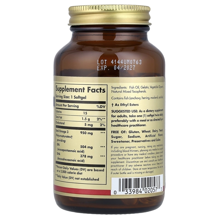 Омега-3 (950 мг) — это самая высокая концентрация натуральных полиненасыщенных кислот омега-3 ЭПК и ДГК от Solgar, полученных из холодноводной рыбы. Данная формула поддерживает здоровье сердечно-сосудистой системы, суставов и кожи. Продукт подвергается молекулярной дистилляции для очищения от ртути.